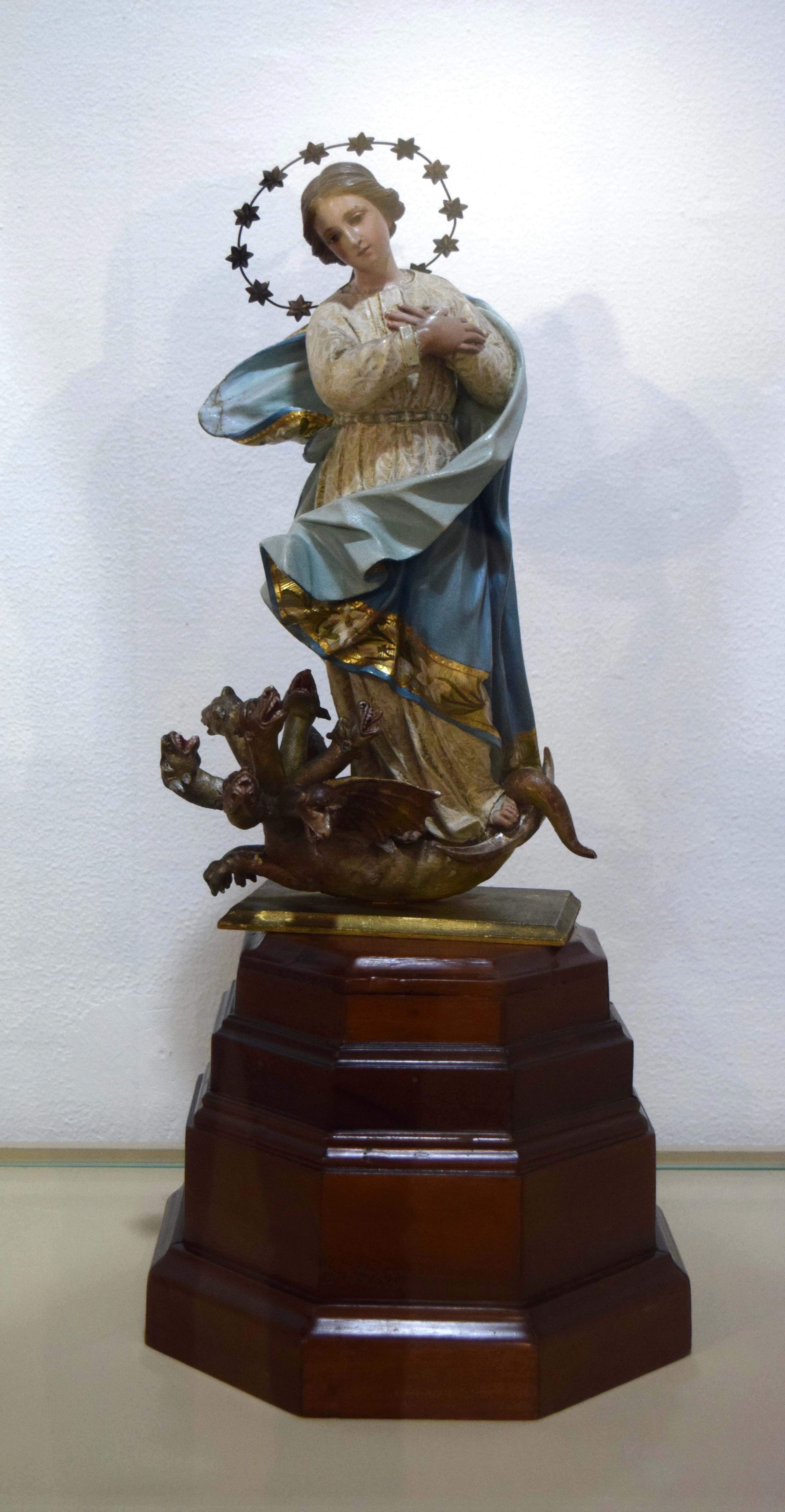 Escultura realizada en madeira policromada que representa a unha Inmaculada Concepción pisando á Hidra das Sete Cabezas. Neste caso, a figura bestial situada aos pés da Virxe adopta unha forma monstruosa, un ser híbrido con corpo de dragón do que emerxen sete cabezas, das que unha está coroada. Sobre él, a Virxe avanzada co seu pé esquerdo sostida por un pequeno crecente lunar. María aparece vestida con unha túnica branca, cos brazos cruzados sobre o peito e cuberta por un belo manto de cor azul, o cal adquire gran amplitude dando a sensación de ser animado polo vento no seu sentido ascensional. A figura, con rostro sereo, mostra a cabeza ladeada cara a dereita, mentres unha coroa composta por doce estrelas de seis puntas completa o conxunto.