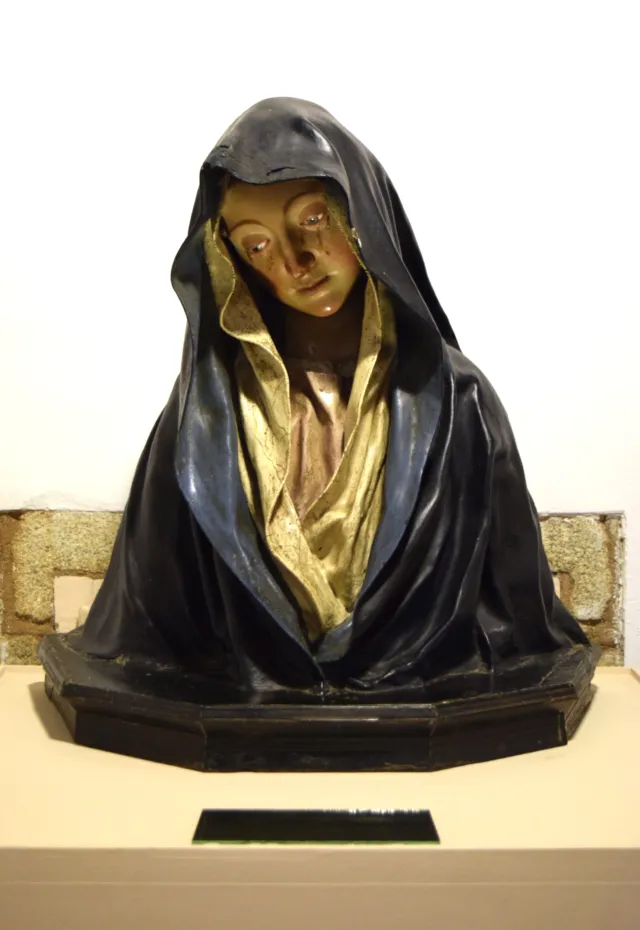 Escultura de busto en madeira policromada que representa á Virxe das Dores. A figura da Dolorosa presenta a cabeza lixeiramente inclinada cara á dereita, cuberta por unha toca branca e un manto azul de pregues ondulantes que enmarcan o rostro, concentrando a atención do espectador na expresión facial. O semblante reflicte a desolación ante a última das sete dores marianas, transmitindo unha profunda introspección e serenidade.